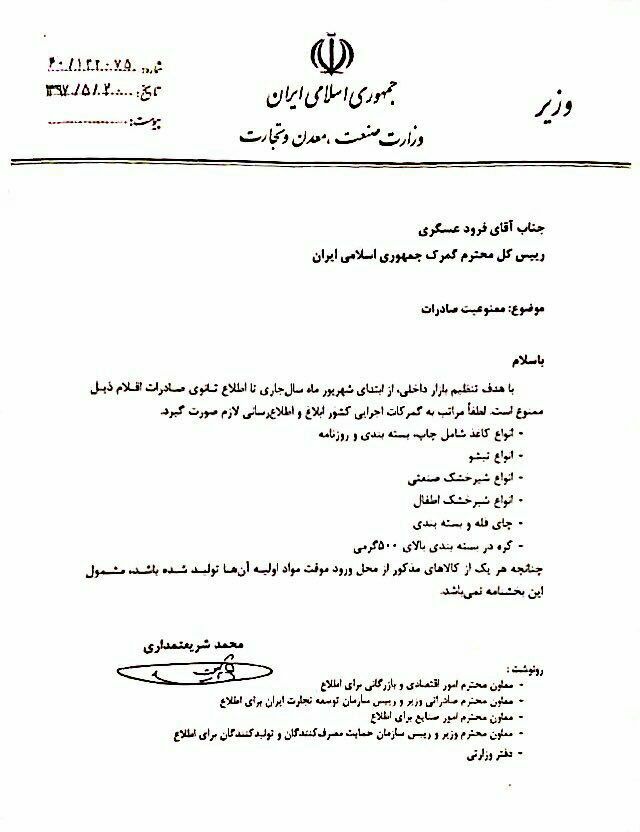 صادرات انواع شیرخشک، چای ، کاغذ و کره از ابتدای شهریور ۹۷ ممنوع مدیر کل۱۳۹۷/۵/۲۳ ،۰۷:۵۰:۲۸ +۰۰:۰۰1397/05/23|اخبار, اطلاعیه ها|۰ Comments این مطلب را به اشتراک بگذارید XLinkedInWhatsAppTelegramEmail Leave A Comment لغو پاسخComment