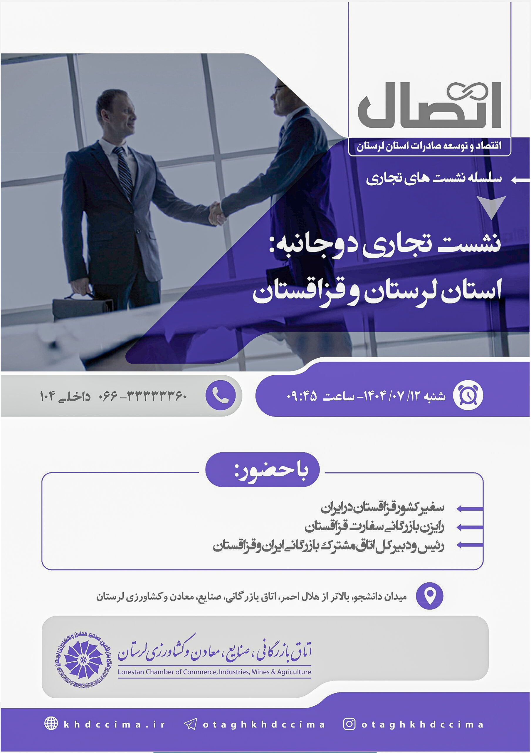 در راستای توسعه روابط تجاری دو جانبه استان لرستان با کشور قزاقستان با توجه به ظرفیت‌های اقتصادی و صادراتی استان لرستان در گروه‌های کالایی محصولات کشاورزی و صنایع غذایی، سنگ و مصالح ساختمانی، دارو و تجهیزات پزشکی، پتروشیمی، صنایع پلیمری و.. ؛ نشست‌تجاری دوجانبه بین استان‌لرستان و کشور قزاقستان در روز شنبه 12 مهرماه 1404 ساعت 09:45 با حضور سفیر محترم کشور قزاقستان در ایران، مقامات اقتصادی سفارت قزاقستان در ایران و همچنین رئیس و هیات مدیره محترم اتاق بازرگانی مشترک ایران و قزاقستان جهت بررسی راههای گسترش روابط تجاری دوجانبه با استان لرستان در سالن جلسات شماره 1 این اتاق برگزار می گردد.