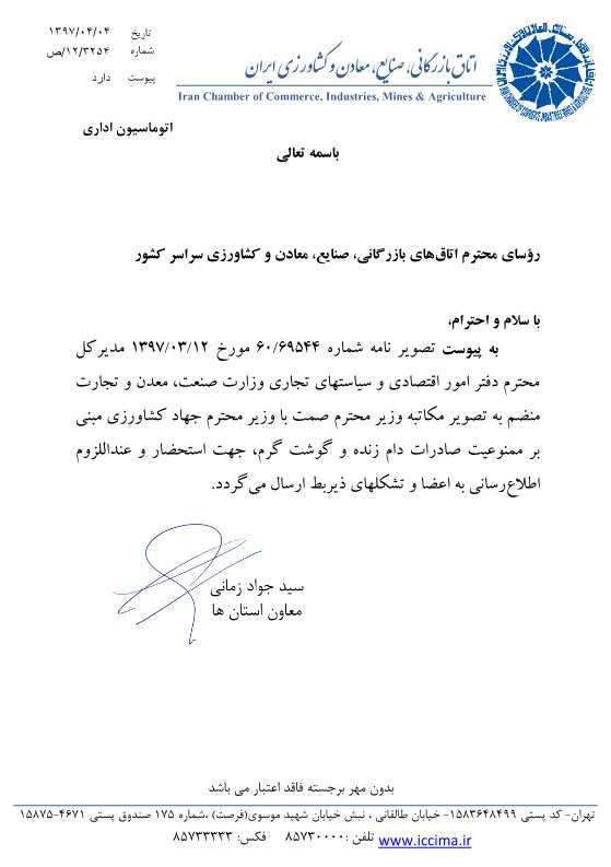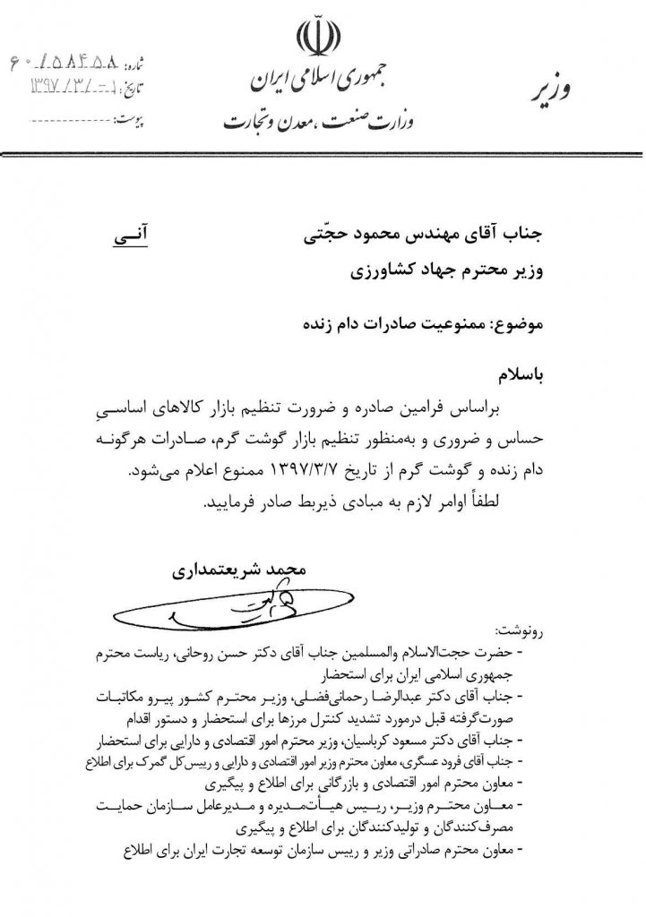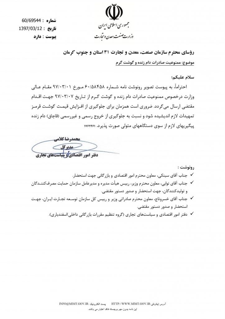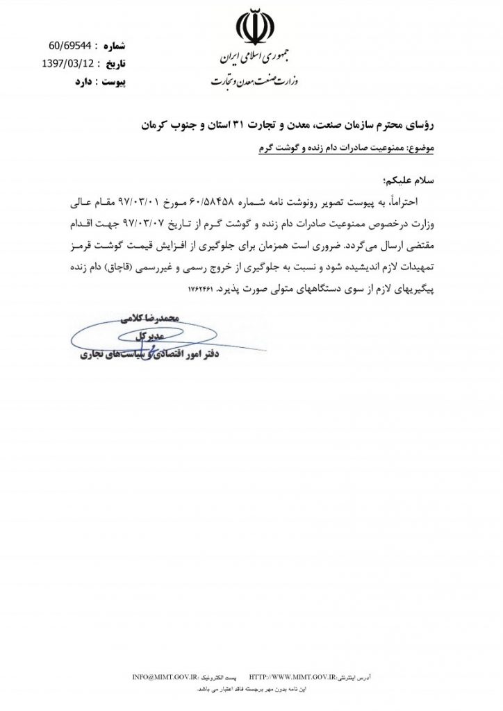 بخشنامه وزیر صنعت، معدن و تجارت درخصوص ممنوعیت صادرات دام زنده و گوشت گرم مدیر کل۱۳۹۷/۴/۵ ،۰۵:۴۹:۱۱ +۰۰:۰۰1397/04/05|اخبار, اطلاعیه ها, ویژه|۰ Comments این مطلب را به اشتراک بگذارید XLinkedInWhatsAppTelegramEmail Leave A Comment لغو پاسخComment
